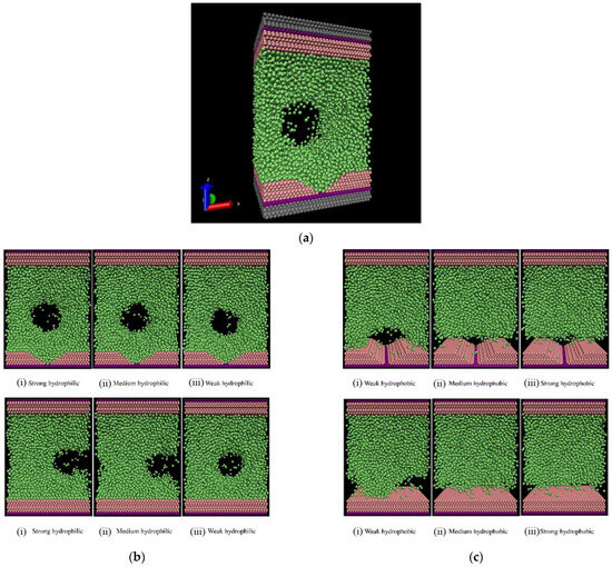 Figure 9a depicts the molecular structure of a vapor bubble inside a solid cavity surface. Figure 9b,c represents the formation of nano-bubbles for hydrophilic and hydrophobic bottom surfaces. The study suggests that the cavity at the bottom can increase the size of the bubble formation, and the bubble initially develops near the vicinity of the cavity rather than on the surface. A greater magnitude of the force is experienced by the Ar atoms along the z-direction for cavity-incorporated systems. It was also observed that decreasing hydrophilic interactions decreases the size of the bubble. On the other hand, due to the presence of a gaseous layer near the surface, for hydrophobic surfaces, the cavity feature becomes irrelevant, which is established from the knowledge of nucleate boiling experiments.