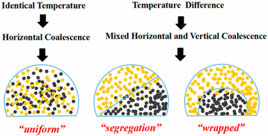 The three modes of coalescence, namely uniform, segregation, and wrapped. Reprinted with permissions from Li et al. [110]. Yellow dots represent the molecules of the nanodroplet at a high temperature whereas the black dots represent the molecules of the nanodroplet kept at a relatively low temperature.