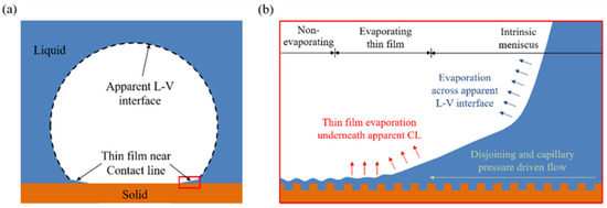 - Maroo, S.C.; Chung, J.N. Nanoscale liquid-vapor phase-change physics in nonevaporating region at the three-phase contact line. J. Appl. Phys. 2009, 106, 064911. [Google Scholar] [CrossRef]