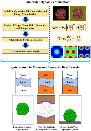 A molecular understanding has become more and more important owing to the recent adaptation of the bottom-up approach. Phase change heat transfer, wetting, nucleation, evaporation, condensation, bubble formation, thin film formation, and so on, have been studied using MD simulations to understand the physics at smaller length scales and, due to their applicability, in various micro and nano-technologies. The next section depicts the application of MD simulations in various micro and nano-technologies.