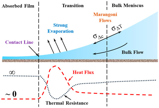 The two-phase heat transfer process utilizes the latent heat of the vaporization to dissipate heat for a given system. Micro/nanostructured surfaces have been implemented to increase the heat transfer coefficients and the critical heat flux of the system for boiling experiments. There are several explanations for the mechanism of increased critical flux, such as an elongated contact line, enhanced bubble departure frequency, enhancement of nucleation site densities, and microlayer evaporation. Among them, microlayer evaporation via wicking is the most widely accepted mechanism [112]. The major objective of the thin liquid film evaporation is to deliver liquid to the heated surface. The evaporating region is divided into three zones [112], as shown in Figure 11, namely the (a) nonevaporating film region, (b) evaporating thin film region, and (c) intrinsic meniscus region. The non-evaporating region is the zone where liquid–solid interactions are strong and the evaporation gets suppressed, in the thin film region an excess pressure known as the disjoining pressure dominates, and in the intrinsic meniscus region, the capillary forces dominate. This disjoining pressure rises rapidly as the film thickness decreases, and its gradient, caused by the thickness variation of the evaporating meniscus, causes the liquid to flow from the intrinsic meniscus to the evaporating thin film region, resulting in high heat flux in the evaporating thin film region. A detailed mathematical derivation of the phenomenon was presented by Hu et al. [113], which was validated through MD simulations. The study was to understand the effect of disjoining pressure for a thin film of water adsorbed on a gold surface. The EAM potential was used to simulate the effect of the interaction among the gold atoms, and the TIP4P-Ew water model was used for water–water interactions. The disjoining pressure was calculated in the absence of electrostatic interactions between gold and water to find them in great agreement with the classical disjoining pressure theory. The electrostatic-induced disjoining pressure was higher and was in a similar trend for experimentally observed polar liquid thin films.