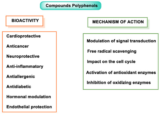 In recent decades, polyphenols have received enormous attention from scientists and nutritionists for their role in human health, as they can help prevent or even treat diseases such as cancer, cardiovascular disease (CVD), and neurological disorders [7]. Their therapeutic effects are based on the antioxidant capacity as free radical scavengers and their involvement in the regulation of cell signaling pathways and gene regulation and expression [8].