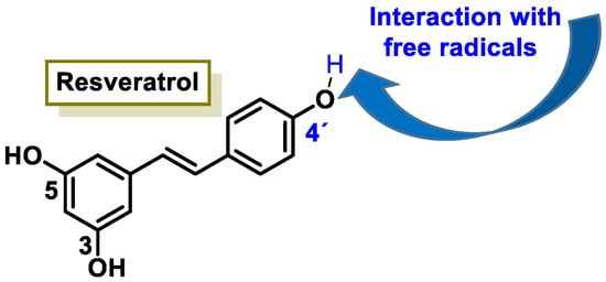 The characteristic antioxidant potential of these three compounds is based on the phenolic OH group, which can donate H+ and remove the unpaired electron through the resonant electron system [32]. The OH groups donate a proton to various radicals •X such as hydroxyl, peroxyl, superoxide, or peroxynitrous acid, which lose their reactivity and in turn form a relatively stable flavonoid radical, called the phenoxyl radical [33]. Figure 3, Figure 4 and Figure 5 show the preferred positions for the formation of phenoxyl radicals for resveratrol, hydroxytyrosol, and luteolin, respectively. Figure 6, Figure 7 and Figure 8 show the resonant structures after formation of the phenoxyl radical in the different positions that are advantageous.