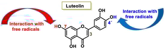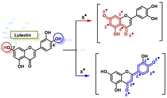 The interaction of a FR (•X) at the OH of the C-7 position resulted in the electron delocalization throughout the A-ring (Figure 7). When •X is generated at C-7 and C-4′ OH positions of luteolin, there is a greater delocalization of the unpaired electron, yielding a greater number of resonant forms (in blue and red). OH located at 7 and 4′ positions were predicted to have greater antioxidant activity.