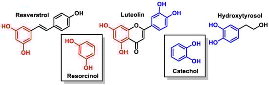 Catechol and resorcinol groups of resveratrol, luteolin, and hydroxytyrosol.
