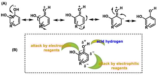 Phenols and polyphenols are nucleophiles susceptible to electrophilic substitution reactions due to their high electron density [36]. The phenolic OH group facilitates the effective delocalization of the charge in the aromatic ring through resonance. In electrophilic aromatic substitution reactions, an electrophile substitutes one or more hydrogen atoms attached to the aromatic ring [37,38] (Figure 10).