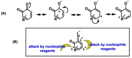 (A) Resonant forms of o-quinones. (B) Positions in o-quinones attacked by nucleophiles.