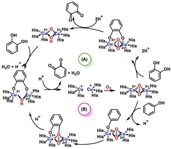 (A) A possible mechanism for the oxidation of o-diphenol and (B) for the oxidation of a monophenol, the cathecholase (cycle A) and cresolase (cycle B) activity of the PPO enzyme [44,45].