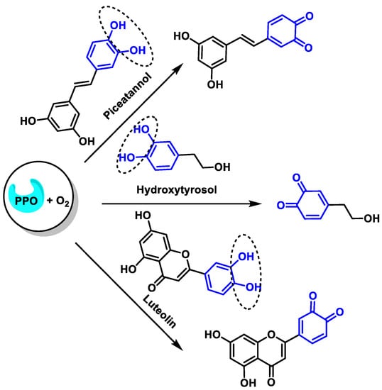 Polyphenols are oxidized by several oxidative enzymes, including cytochrome P450, COX-2, peroxidase, tyrosinase, XO, monoamine oxidase (MAO), and polyphenol oxidases (PPO)into highly reactive quinones [40]. PPO (widely distributed in the animal and plant world) is a group of copper-containing enzymes that catalyze the o-hydroxylation of monophenols to catechols and the oxidation of catechols to quinones in the presence of oxygen [41]. The hydroxylation reaction is kinetically slower than the oxidation reaction. As a result, quinones are obtained as products [42] (Figure 12).