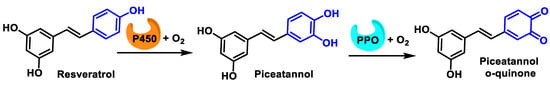 Enzymatic oxidation of the B-ring of resveratrol proceeds according to a two-step process, in the first of which cytochrome P450 oxidizes phenol to catechol and subsequently PPO oxidizes catechol to o-quinone [55] (Figure 15).