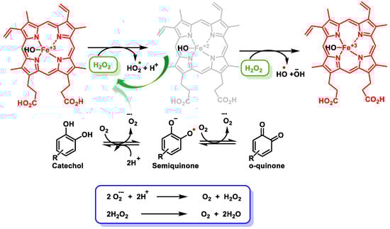 As we have seen in the oxidative process that catechol undergoes by means of PPO enzymes, 2H+ + 2e− are generated and, in the presence of O2, produce H2O2. It must be remembered that O2, with one e−, is transformed into •O2−. In other words, the oxidative process of polyphenols yields a mixture of quinones and semiquinones, so that the reducing species will be used in the reduction of FR but also in the reduction of O2, producing ROS.