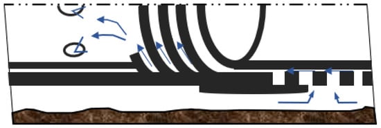The channel-type inflow control device (ICD) is an inaugural manifestation within the pantheon of ICD categories, characterized by utilizing distinct channel lengths to modulate fluid dynamics []. Fundamentally rooted in its design, the channel-type ICD harnesses an extended conduit, thus engendering an augmented pressure differential consequent to fluid traversal. This orchestrated pressure dichotomy engenders a corresponding subdued flow velocity, mitigating the propensity for erosive and obstructive events. Nonetheless, concomitantly, in scenarios typified using heightened oil–water viscosity ratios, the emergent frictional interactions furnish a pronounced pressure differential variance, as shown in Figure 1. The flow pattern can be clearly seen in Figure 1, where fluid flows from the reservoir into the channel-type ICD and the wellbore through internal channels in the channel-type ICD.