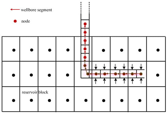 The amalgamation of the gravel pack and inflow control device (ICD) completion methodology has hitherto manifested a partial implementation within the ambit of the South China Sea, yielding discernible outcomes. However, the comprehensive elucidation of this amalgam’s efficacy remains delimited by a paucity of mathematical models proficiently encapsulating both the granular comportment of gravel packing and the intricate attributes inherent to ICD-driven water control completions. Presently, commercially available software platforms are amenable to the dynamic prognostication of water control completions within horizontal wells ensconced in bottom-water reservoirs, such as the Eclipse and Netool software suites. Eclipse software embodies a multifaceted framework engendering coupled simulations, encompassing both the fluid dynamics within horizontal wellbore conduits and the reservoir seepage phenomena, conjoined within the ambit of a segmented well mathematical model, as shown in Figure 2. To meet the variegated exigencies of water control completions, Eclipse software has burgeoned to encompass an augmented simulation functionality for an assorted array of ICD completion tools, affording users the prerogative of tailored tool selection. In particular, the labyrinth-type ICD and spiral channel-type ICD are denoted with the keywords WSEGLABY and WSEGSICD, respectively []. Conversely, the Netool software augments predictive capabilities by invoking a steady-state production model to unravel the reservoir inflow dynamics vis à vis the horizontal wellbore. This is further complemented with a multiphase flow model that effectively unravels the intricate nuances governing the variable mass flow within the horizontal wellbore. A network of nodes underpins the amalgamation of diverse flow paradigms, enabling an integrated solution. Facilitated by its nodal architecture, Netool extends an extensive repertoire of well completion simulations, encompassing open-hole configurations, perforated completions, water-controlled methodologies, gravel-packed implementations, and more [].