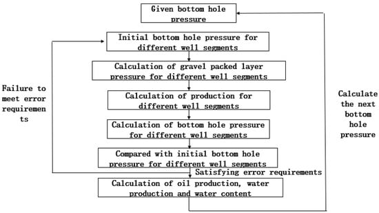 We first calculate the case of constant bottom hole pressure and set the initial value of bottom hole pressure for each horizontal segment, take the corresponding gravel-packed layer pressure of each horizontal segment as an unknown, and carry out a joint solution to calculate the gravel-packed layer pressure of each horizontal well segment. We calculate the horizontal section pressure drop using the production rate of each horizontal section and obtain the flow pressure of each horizontal section under the current production rate. Then, we compare the initial value of the bottom hole pressure, and if the error is large, the above process is repeated with the calculated bottom hole pressure as the initial value again until the error requirement is met. Given different bottom hole pressures, the above steps can be repeated to obtain production at different bottom hole pressures, and the corresponding oil production, water production, and water content can be obtained, as shown in Figure 4.
