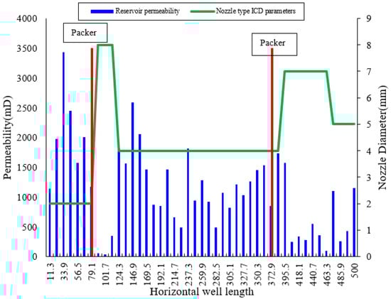 Utilizing a representative horizontal well within a bottom-water reservoir as a pivotal case study, we have orchestrated the employment of a coupling model emblematic of horizontal wells seamlessly integrating gravel packing and inflow control device (ICD) completions in the context of bottom-water reservoirs. This paradigmatic construct has been harnessed as the fulcrum for our comprehensive computational endeavors. Within this investigative ambit, we have carried out an intricate array of sensitivity analyses, systematically probing the nuanced ramifications stemming from diverse oil viscosities, reservoir permeabilities, gravel-packed layer permeabilities, and water saturations at distinctive production stages. This systematic exploration casts an illuminating spotlight on the efficacy underpinning water control measures. A comprehensive juxtaposition of strategies, including gravel pack combined with ICD completions, conventional ICD completions, and traditional screen tube completions, has been rigorously conducted. Inherently, the horizontal wells probed herein exhibit an extended length of 500 m, with water control production aptly governed via nozzle-type ICDs. The horizontal well configuration is thoughtfully segmented into 50 discrete sections, undergirded via meticulous alignment with ICD design parameters, grounded in the horizontal well permeability profile. Moreover, conventional ICD completions have been adroitly applied, featuring the imposition of dual packers to effectively seal the horizontal well conduit, as shown in Figure 5. Table 1 illustrates the basic parameters.