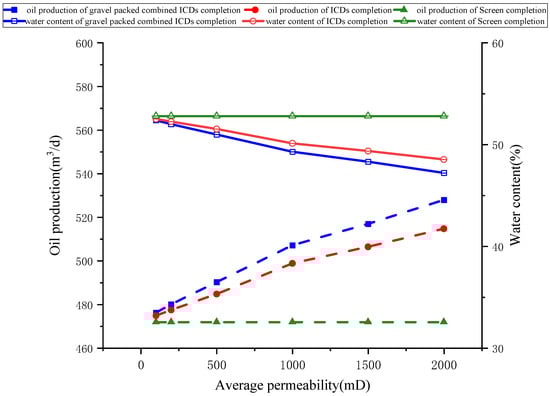 Evidently discernible within the graphical representation, a positive correlation unfolds between the augmentation of reservoir permeability and the progressive attenuation of water content within both gravel-pack-combined ICDs and conventional ICDs. This trend inescapably culminates in the augmentation of the water control efficacy of the well, signifying a marked improvement relative to conventional screen tube completions. However, a noteworthy pivot materializes as the permeability ventures below the threshold of 200 mD. At this juncture, the efficacy of gravel-pack-combined ICD completion begins to manifest a gradual decline in conventional ICD completion.