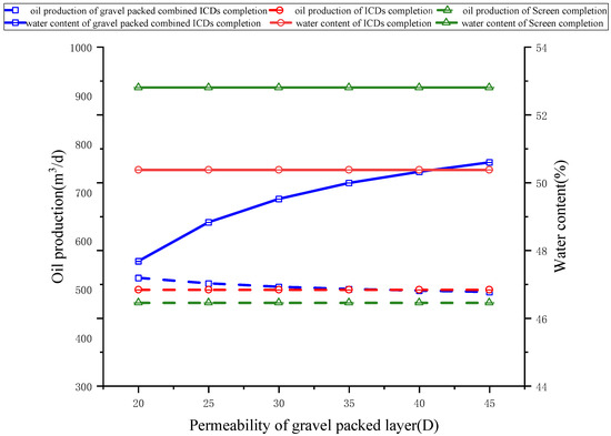 The graphical representation depicts the relationship between gravel-packed layer permeability and ensuing outcomes. Notably, the water content of screen tubes and conventional ICDs exhibits consistent stability across diverse permeabilities. Conversely, a discernible upward trend is observed in the water content of gravel-pack-combined ICDs, correlating with a concomitant decline in water control effectiveness. Intriguingly, this trend assumes an accentuated trajectory, culminating in a substantial deterioration in water control outcomes as the permeability of the gravel-packed layer surpasses the threshold of 40D. Importantly, within this context, the water control efficacy of gravel-pack-combined ICDs markedly lags behind that achieved using conventional ICDs.