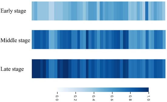 We use numerical simulation models to extract characteristic water saturation parameters. In the early production stage of horizontal wells in the bottom-water reservoir, the water saturation of the reservoir is relatively low. In the middle production stage, water cones begin to appear where permeability is high. In the late production stage, most of the horizontal wells are in the high-water-containing area. The saturation distribution along the direction of the horizontal wells in different stages is shown in Figure 9. The calculation of water control effects under different production stages using the coupled model. The results are shown in Figure 10.