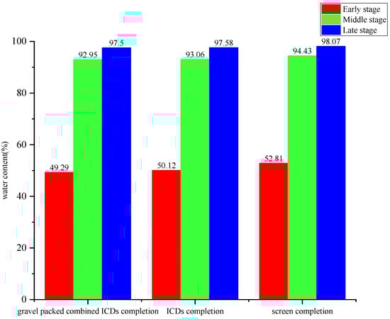 The graphical elucidation distinctly portrays the evolving water control efficacy across distinct production stages. During the initial production phase, the gravel pack combined with ICDs demonstrably outperforms conventional ICDs, yielding a notable differential. Advancing into the intermediate production stage, this comparative effectiveness persists, albeit with a gradually narrowing gap. However, as the production trajectory transitions to the latter phase, a remarkable shift emerges. Herein, the water control effectiveness of conventional ICDs supersedes that of gravel packs combined with ICDs. Furthermore, it is pertinent to observe that the water control effectiveness of gravel packs combined with ICDs even surpasses that achieved using screen tubes within this context. This observed phenomenon predominantly stems from the late-stage production dynamics, wherein, in pursuit of heightened production outcomes, an expansion in pressure drop ensues. Regrettably, this amplified pressure drop precipitates a decline in the sealing efficacy of the packed gravels, a trend contributing to the observed variations.