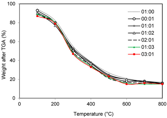 The thermal stability of the biomass was analyzed using thermogravimetric analysis (TGA) in accordance with existing studies. TGA was carried out at three different stages, with a broad temperature range from 0 °C to 800 °C, in order to determine the pyrolytic temperatures for the hydrothermal experiments. Figure 1 shows that the moisture content was removed below 180 °C at the first stage, and the degradation of organic components occurred between 200 °C and 600 °C at the second stage. The weight loss percentages at 600 °C after TGA were 21, 18, 20, 20, 17, 16 and 15% for heating rates of 10, 20, 30, 40 and 50 °C/min, respectively. The carbonaceous material became degraded in the final stage. According to Arun, Gopinath, SundarRajan, Malolan, Adithya, et al. (2020), Scenedesmus obliquus exhibited a maximum weight loss of 23.4% at a heating rate of 50 °C/min.