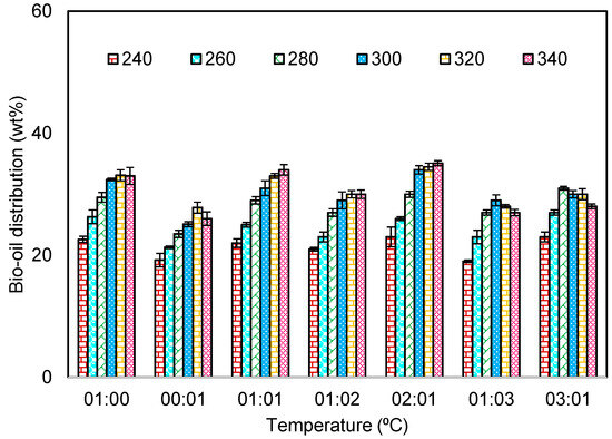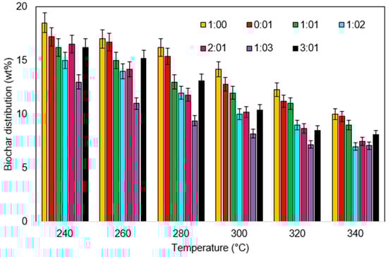 The effect of temperature on the bio-oil yield was studied at varying temperatures from 240 to 340 °C for a 1-h reaction time. From Figure 2, it can be seen that the maximum bio-oil yield was 30 wt% at a temperature of 300 °C for a reaction time of 1 h. For the temperature range of 200 to 250 °C, the total biochar wt.% increased significantly, leading to a steep drop in the biomass wt%. One possible reason for this observation is due to carbonization of intermediate compounds from the biomass to form biochar [22]. The increase in the temperature resulted in conversion of the low-molecular-weight compounds in the bio-oil into a gaseous phase. The biochar distribution of the 10 g/200 mL batch run is depicted in Figure 3. The biochar (20 wt%) was the major charred matter that was obtained from the solid residue. This carbon percentage enhanced the chance of using biochar as the soil amendment, with the biochar yield at a reaction temperature of 250 °C. From the literature, it was seen that low temperatures of the HTL process when compared to the pyrolysis process results in higher amounts of biochar. The HTL-based biochar formation depends upon the residence time, temperature, catalyst type, feedstock composition, etc. [27].