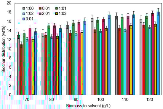 One important factor is the mass ratio of biomass to water. In general, a lot of water is good for producing liquids and yielding gases, presumably because a denser solvent medium improves extraction. A rise in the salvation of biomass components can be connected to this decrease. Solvents are used to derive the biomass components during hydrothermal treatment so that the biomass fragments dissolve more easily. The relative interactions between the water and biomass molecules become less significant at large biomass to water ratios, which can reduce the rate at which the biomass components dissolve. When the biomass to solvent ratios are extremely high, hydrothermal processes frequently behave like pyrolysis. However, increasing the biomass to water ratio does not always yield high liquid amounts [28]. In this study, the experimental results were summarized to understand the recovery of bio-oil and biochar as products using various ratios of biomass to solvent. The bio-oil and biochar as HTL products were obtained using the solvent to biomass ratios. Figure 4 and Figure 5 show the ratios of solvent to biomass of 110 g/L that generated the maximum amounts of bio-oil (29 wt%) and biochar (17.5 wt%).
