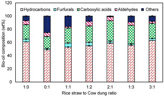 The rice straw at a 1:00 ratio was found to contain 31% hydrocarbons, 4% furfurals, 22% carboxylic acids, 6% aldehydes and 7% other compounds. The pure cow dung at a 0:01 ratio was found to contain 49% hydrocarbons, 2% furfurals, 18% carboxylic acids, 6% aldehydes and 25% other compounds. From the figure, we were able to see that the wt% of each compound varies at different proportions of rice straw and cow dung (1:01, 1:02, 2:01, 1:03, 3:01). From the 1:01 ratio of rice straw and cow dung, 53% hydrocarbons, 6% furfurals, 23% carboxylic acids, 2% aldehydes and 16% other components were estimated. The 1:02 ratio showed the presence of 55% hydrocarbons, 5% furfurals, 25% carboxylic acids, 7% aldehydes and 8% other components. The 2:01 ratio was found to contain 59% hydrocarbons, 3% furfurals, 31% carboxylic acids, 6% aldehydes and 1% other components. The 1:03 ratio showed the presence of 56% hydrocarbons, 2% furfurals, 28% carboxylic acids, 5% aldehydes and 9% other components. Likewise, the 3:01 ratio was found to contain 63% hydrocarbons, 3% furfurals, 23% carboxylic acids, 3% aldehydes and 8% other components. The maxima observed from the bio oil acquired through the HTL process were 63% hydrocarbons from the 3:01 ratio, 6% furfurals from the 1:01 ratio, 31% carboxylic acids from the 2:01 ratio, 7% aldehydes from the 1:02 ratio, and 25% other components from the 0.01 ratio. The nitrogen-containing substances found in the bio-oil could be a by-product of the breakdown of protein molecules. The ester compounds content was similar to that of the hydrocarbons, although that of the other compounds was quite low. The hydrothermal liquefaction of red oak and cattle manure, particularly cow manure, produced gaseous products that included similar sorts of chemicals [23].