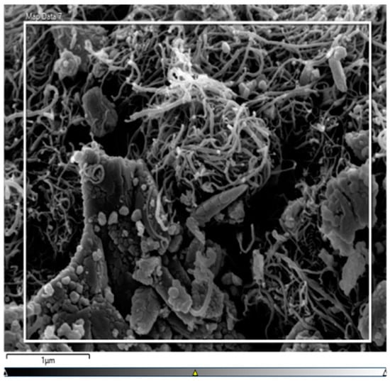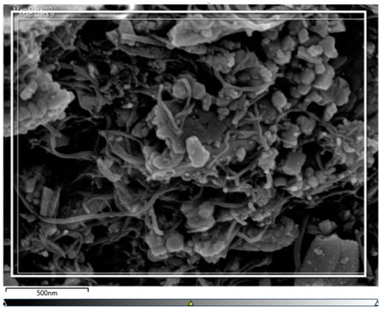Scanning electron microscopy (SEM) (JEOL JSM-6510, JEOL Ltd., Akishima, Tokyo, Japan) was used to examine the surface characteristics, morphology and microstructures of the biochar obtained from the HTL process. Then, the sample of biochar was sprinkled with gold for 30 s using polarons, and the captured spectra results were displayed in a stereoscope. This may facilitate the adsorption procedure by enhancing the dispersion of dye molecules across the biochar structure [23].