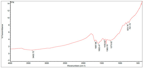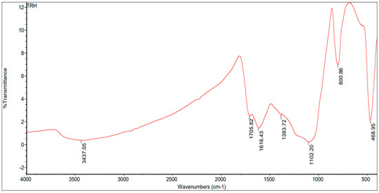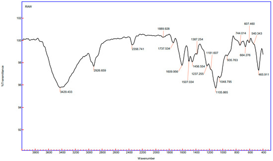 The functional groups present in the biochar synthesized from cow dung and rice straw in a proportion of 2:1 were identified via FT-IR analysis as presented in Figure 9, Figure 10 and Figure 11. The major functional groups identified were C=N, C-O, Si-O-Si and C=C, and their intensity varied in the biomass as their internal biological composition varied. In the biochar derived from cow dung biomass, the intensity of the peaks was lower, at 1609.95 cm−1, 1737.53 cm−1, 1889.92 cm−1, 2356.74 cm−1, 2926.65 cm−1 and 3429.42 cm−1. The biochar derived from the rice straw had peaks at 3402.72 cm−1, 1697.96 cm−1, 1602.47 cm−1, 1435.62 cm−1, 1383.79 cm−1 and 1273.02 cm−1. The biochar derived from the mixed biomass (2:1) had peaks at 3437.05 cm−1, 1705.82 cm−1, 1616.43 cm−1, 1383.72 cm−1 and 1102.20 cm−1.