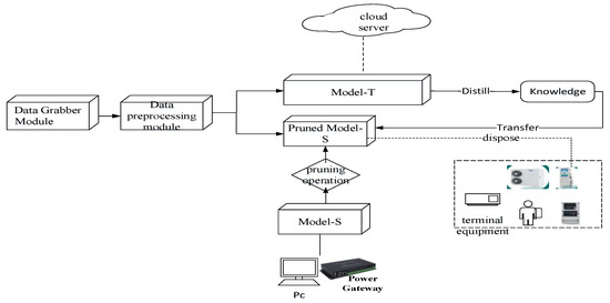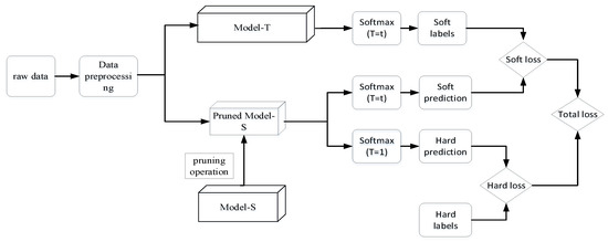 - “Knowledge” transfer: Model-T has strong learning generalization ability and can transfer the learned knowledge to the relatively weak learning ability of the Pruned Model-S, which is used to enhance the generalization ability of the Pruned Model-S as well as to improve its recognition accuracy. Complex Model-T is not online, and only Pruned Model-S with low resource consumption and low latency is deployed when the model is deployed.