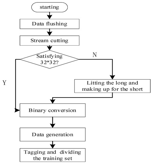 Considering the temporal relationship between different packets in the same stream, the second half of the data preprocessing is improved in this paper. Here, the first 32 packets in a stream are selected and the first 32 bytes of each packet are taken and formed into a 32 × 32 2D image matrix. These processed data are closer to the form of an image which helps to better capture the temporal sequence between packets and thus improves the accuracy of service identification. The specific data processing flow is shown in Figure 3: