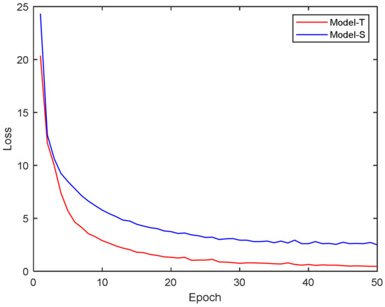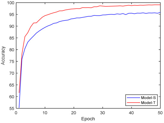 The dataset after the data preprocessing module is subjected to a shuffle operation, i.e., the order of the dataset is randomly disrupted as a way to avoid the phenomenon of the overfitting of the network model caused by the fixed order of the dataset. The training set is partitioned into 70% for model training and 30% for testing. The training accuracy as well as the loss of Model-T and Model-S are shown in Figure 5 and Figure 6: