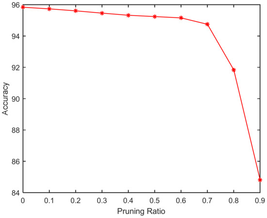 The pruning method chosen in this paper is convolutional kernel pruning whose advantage is that it can ensure that the number of parameters and computation of the neural network can be greatly reduced under the condition of high accuracy, so as to improve the running efficiency of the model and save storage space. Compared with neuron pruning and weight pruning, convolutional kernel pruning is more efficient because convolutional kernel pruning can cut out a whole convolutional kernel, while neuron pruning can only cut out a neuron, and weight pruning can only cut out a weight. In addition, convolutional kernel pruning results in easier hardware acceleration because the number of multiply–add operations can be reduced by decreasing the number of convolutional kernels, thus increasing the computational speed of the model. In addition, convolutional kernel pruning can also improve the generalization ability of the model, as pruning can induce the model to learn more general features and avoid overfitting. However, it should be noted that excessive pruning can lead to model underfitting, so the convolution kernel pruning needs to be adjusted according to the actual situation. In conclusion, convolutional kernel pruning is an effective model compression method that can significantly reduce the number of parameters and computation of the neural network, improve the operation efficiency of the model, and save storage space. At the same time, it can also improve the generalization ability of the model, but we need to pay attention to the appropriate control of the degree of pruning to avoid model underfitting.