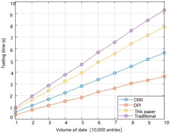 In order to compare the recognition efficiency of the proposed algorithm with popular algorithms such as CNN, DPI, and the traditional two-stage service recognition, different numbers of pre-processed completed data were used for testing. All the samples of the traditional two-stage model have to go through the DPI detection module and the deep learning module, while the two-stage model of this paper only inputs the results that DPI fails to recognize into the deep learning model for recognition. The results are shown in Figure 9.