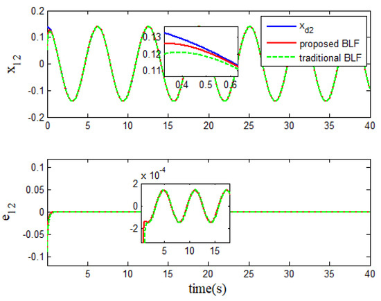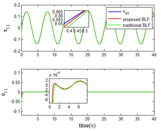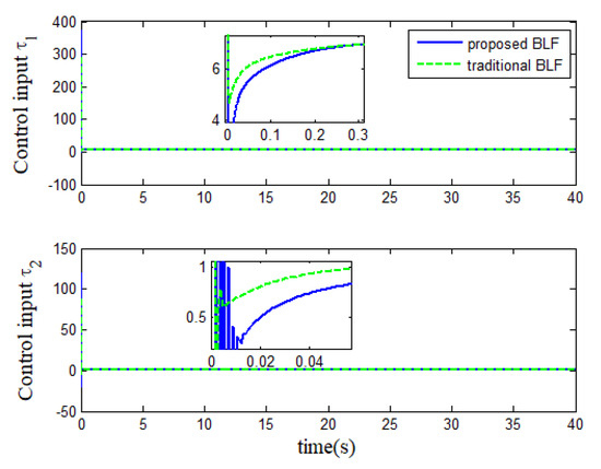 - Different from the existing logarithmic BLFs [35,36,37,38,43,44,45,46], the improved BLF-based control scheme is a universal one that can be used simultaneously in systems with constraint requirements and without constraint requirements, without altering the designed controller. In addition, the inequality condition for the proposed barrier function is also given to provide a basis for the subsequent proof of system stability. At the same time, it has been theoretically proven that the proposed barrier function can directly design the controller for unconstrained systems.