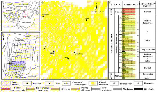 Location of the Ordos Basin and stratigraphy of Yanchang Formation. (a,b) indicate the location of Ordos Basin and study area, respectively; (c) displays the distribution of Chang 8 sandstones, (d) indicates the atrata and lithology of Yanchang Formation.