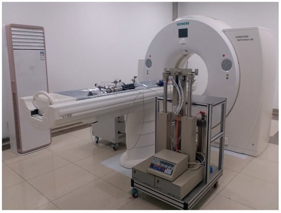 Morphological observation of the condensed water was conducted using a Quantrr S environmental scanning electron microscopy (ESEM) at Peking University. The core flooding experiment system used at the China University of Petroleum (Huadong) mainly includes pipelines, a back pressure valve, a 260D ISCO pump, and a SOMATOM Definition AS X-ray dual energy CT scanner and an X-ray transparent core holder (Figure 2). The fluid used in the oil–water displacement experiments include No. 2 white oil (with a kinematic viscosity of 2 mPa·s at 40 °C), deionized water (used as the confining pressure fluid in the core holder), and 23% wt NaI aqueous solution. In order to mimic the pore fluid pressure in the subsurface conditions, the back pressure was set to 15 MPa at the downstream pipeline. The confining pressure was set to be 2 MPa higher than the pore fluid pressure during the core flooding experiments. The experiments were carried out at room temperature (about 24 °C), and the white oil used had a similar viscosity with crude oil subsurface.