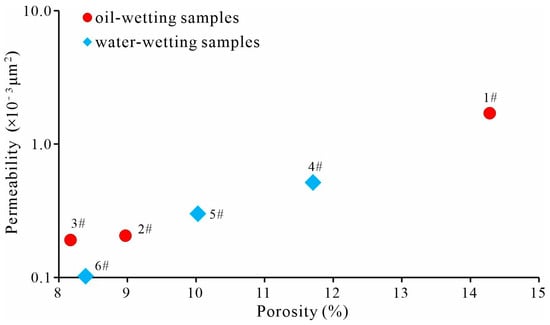 The selected six samples are representative of porosity and permeability characteristics ranging within the entirety of all the Chang 8 reservoirs in the studied area. The porosity ranges from 8.17% to 14.28%, with a median value of 9.37%. The permeability ranges from 0.10 × 10−3 μm2 to 1.71 × 10−3 μm2, with a median value of 0.26 × 10−3 μm2. On the correlation plot of porosity and permeability, all data points are essentially on a line (Figure 3).