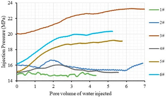 The downstream back pressure regulator in the experiments was set to about 15 MPa, and the upstream fluid injection pressure of each sample was above this value. In general, when injecting the same volume of fluid, the fluid injection pressures were quite different for these six samples (Figure 5). The curve, such as that seen in samples #3, #5, and #6, mostly shows a rapid increase, and then gradually becomes stable with increasing injected fluid volume. For samples #1, #2, and #4, the injection pressure increases at a relatively small scale, and then appears to be stable or decreased.