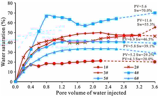 Figure 6 shows the results of the waterflooding experiment. The plots of water saturation varying with the volume of water injected show a rapid increase in the early stage and a slow increase or even a near-flat trend during the later stage. For the oil-wet samples 1#, 2#, and 3#, the change point of the water saturation curve which is lining the early and later stages appears at an injected water volume of about 0.4 pore volume (pv), 0.4 pv and 0.9 pv, respectively. The final water saturation levels for these three samples are about 20.0% (4.3 pv), 46.5% (6.9 pv), and 55.3% (11.6 pv), respectively. For the water-wet samples 4#, 5#, and 6#, after the overall injected water volume reaches 0.8 pv–1.2 pv, the trend of the water saturation varying with water volume becomes gentle. At the end of the waterflooding experiments, the final water saturation levels of these three samples are about 70.0% (5.6 pv), 39.1% (5.8 pv), and 29.2% (4.3 pv), respectively.