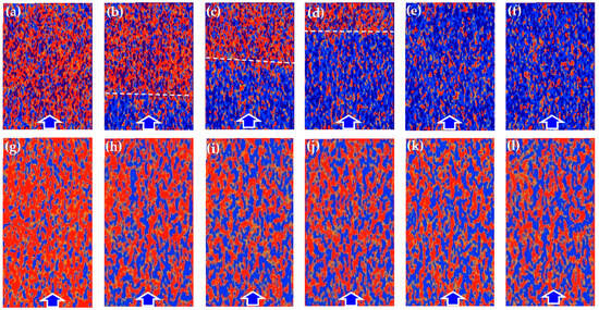 Slices of core samples during the process of water displacing oil. (a–f) represent sample 4#, (g–l) represent sample 1# with the injected water volumes of 0 pv, 0.2 pv, 0.4 pv, 0.6 pv, 0.8 pv, and 1.0 pv. The red represents the oil-enriched area, blue represents the water-enriched area, blue arrows indicate the direction of water injection from the bottom to the top of image, and the dash lines indicate the displacement front; the image width is about 2.5 cm.