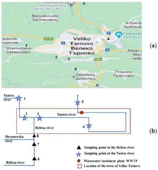 Eight water sampling points (SPs) from the Yantra River and the Belitsa River (Table 1) were selected to assess the current state of the water body and the influence of river tributaries and point sources of pollution, such as untreated WW discharge. SP 1 was chosen to reflect the state of the river in a rural area about 2 km before its passage through the town of Veliko Tarnovo. SPs 2, 3 and 4 allow tracing the state of the Yantra River as it passes through the urban territory of Veliko Tarnovo and the potential influence of diffuse and point sources of fecal pollution, because some of the domestic and industrial WW of the town is discharged untreated into the Yantra River. In the same way, the sewage of the town of Debelets discharges into the Belitsa River. Two SPs were chosen to provide an opportunity to evaluate the influence of discharged untreated waste water: SP 2 on the Yantra River and SP 7 on the Belitsa River. Selection of SPs 2, 3 and 8 allows comparison of the water quality of both rivers and assessment of the effect of the Belitsa River confluence on the Yantra River.