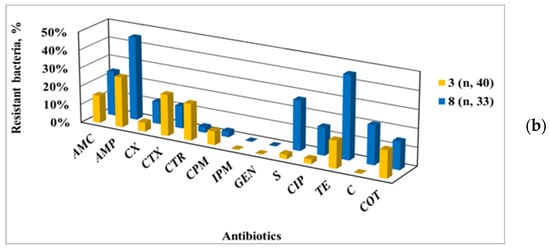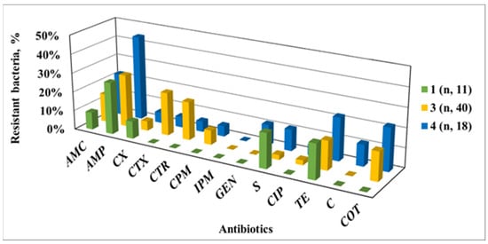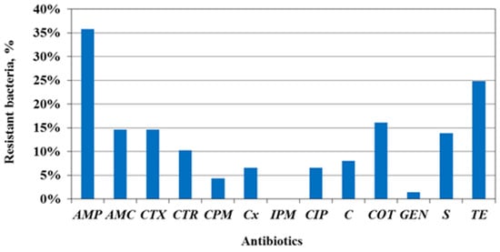 The most common resistance among Enterobacteriaceae isolates was to the ‘old’ ABs—ampicillin (36%), tetracycline (25%) and co-trimoxazole (16%). The lowest resistance was determined to be to gentamicin (1%) and cefepime (4%), a fourth-generation cephalosporin. All isolates were susceptible to imipenem. If the AMR data are interpreted according to the criteria for clinical isolates of ECDC, a high prevalence level (from 25 to <50%) is detected against AMP and TE; a medium level (10 to <25%) is detected against ABs from three classes; a low level (5 to <10%) is also detected to three AB classes; and a very low level (1 to <5%) is detected to CPM and GEN.