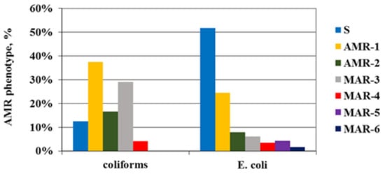 The MAR of the Enterobacteriaceae isolates was 19%, as 16% of E. coli strains (n, 18) and 33% (n, 8) of coliforms were multidrug-resistant. However, only among E. coli strains was MAR to five or six AB classes detected (respectively, 4% and 2%) (Figure 3).
