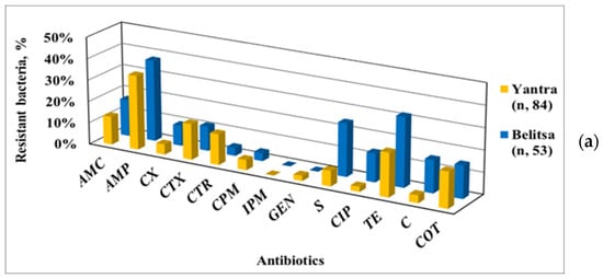 Based on the AMR data, a comparison between the Enterobacteriaceae strains isolated from the Yantra River and its tributary, the Belitsa River, was made (Figure 4a), as well as between the isolates from two particular SPs, each one representative of the water body on which it is located (Figure 4b).