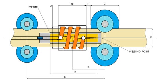 Heating occurs due to the flow in the pipe structure of source currents generated in the inductor (letter “D” in Figure 1) and eddy currents generated in the pipe material []. Ensuring the appropriate density of eddy currents in the welding area requires forcing the concentration of the magnetic field. For this purpose, an element concentrating the magnetic field, commonly referred to as an “impeder”, is used in the system [,]. It is a mandrel of ferromagnetic material placed inside the tube (letter “F” in Figure 1).
