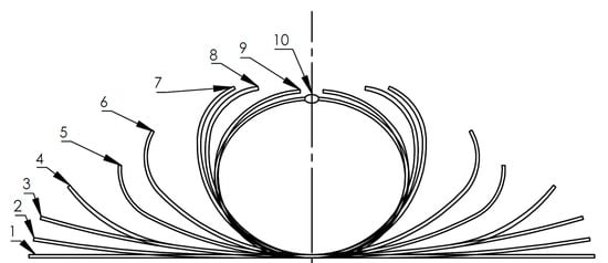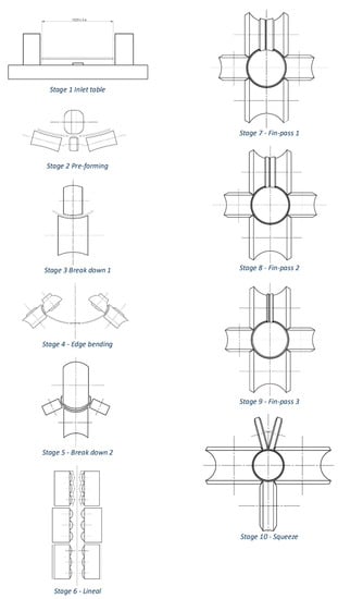 The change in geometry during the pipe formation in the individual stages: 1—inlet table; 2—preforming; 3—breakdown 1; 4—edge bending; 5—breakdown 2; 6—lineal; 7—fin-pass 1; 8—fin-pass 2; 9—fin-pass 3; 10—squeeze.