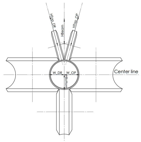 Squeeze stand. W_DR and W_OP—position of horizontal side rolls; HBottom—position of the bottom roll; Htop-DR and Htop-OP—positions of the inclined rolls operating independently of each other; Hbeam—position of jointly sliding inclined rolls.