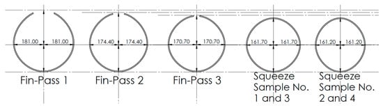 Figure 5 shows the final steps of the pipe formation in the fin-pass stands and the squeeze in the squeeze stand for the 4 samples.