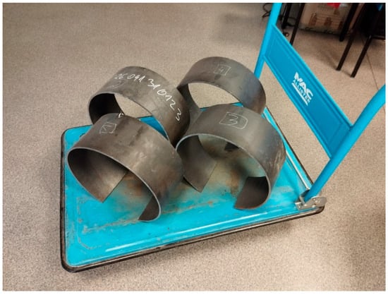 Metallographic tests of the connection structures made in the process of longitudinal induction welding of the pipes sized 323.9 mm × 5.6 mm were carried out to determine the effect of the inductor position, the squeeze value, and the power on the geometry and internal quality of the joint. Samples were taken from the 4 test pipes and polished for the purpose of examination of the joints. The samples are shown in Figure 7 and the measurement sites are shown in Figure 8.